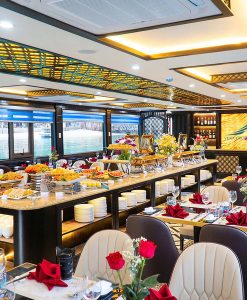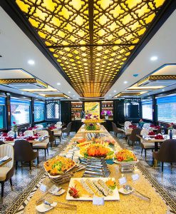 12h00: Du khách thưởng thức bữa trưa Buffet cao cấp với những món ăn Hải sản tươi ngon đặc sắc của vùng biển Hạ Long cũng như các món ăn truyền thống của Việt Nam. (Nếu tàu chạy dưới 20 khách, Quý khách sẽ được phục vụ ăn trưa theo Set Menu)